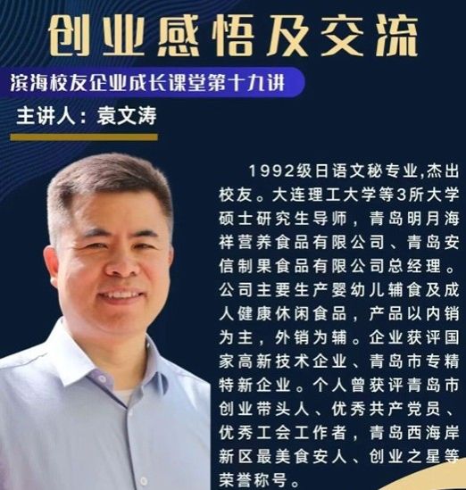 为搭建校友交流平台、赋能校友企业发展,4月11日上午,青岛滨海学院校友企业成长课堂第十九讲《创业感悟及交流》,在青岛明月海祥营养食品有限公司会议室顺利开讲。校友企业联合中心主任委员杜金桂、西海岸新区晨煦公益服务中心主任王晓卫等26位校友代表齐聚,共话创业、共探发展。活动伊始,吴灵慧对各位校友的到来表示欢迎,解读了校友企业联合中心的使命、愿景与价值观,随后隆重引出本次主讲人——青岛滨海学院1992级杰出校友、...