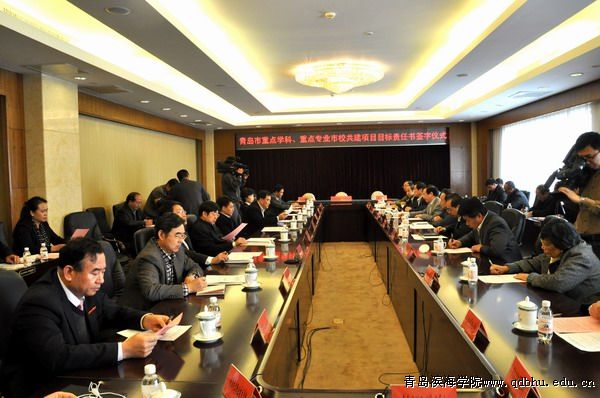 2013年11月18日上午,青岛市首批重点学科、青岛市高职重点专业市校共建项目目标责任书签字仪式在青岛市市级机关会议中心举行。青岛滨海学院校长韩方希作为代表出席签字仪式,与青岛市委高校工委书记、教育局局长邓云峰,青岛市财政局副局长陈强等领导共同签订目标责任书。