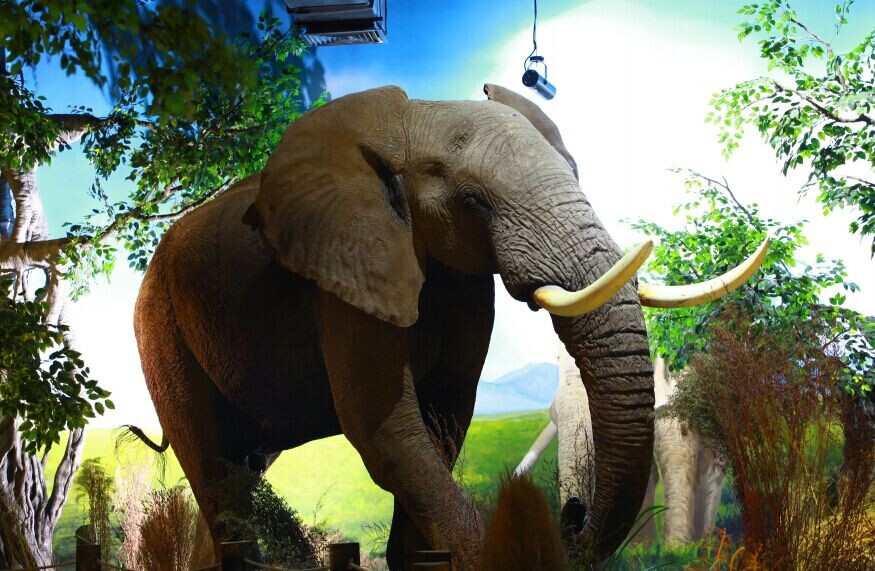 非洲象是陆地上现存最大的陆地动物和第二高动物,喜群居,性情警惕而暴躁。雄性和雌性非洲象呈二态性(雌雄两性在体形或身体特征上都有所不同)。被美国濒危物种法案和世界自然保护联盟列为濒危物种,被CITES列入附录。青岛滨海学院世界动物标本艺术馆馆藏非洲象标本原生动物系雄性,长5.5米,宽1.2米,高3米,其体型居世界轮椅基金会创始人贝林先生全世界捐助非洲象标本第二位。