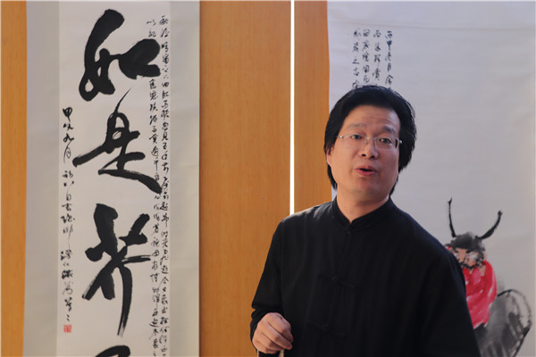 作品展期间,李荣明向大家讲解了他的作品,讲到他创作的灵感,是来自于他的恩师吴悦石,他十分感谢恩师吴悦石的提拔,并鼓励同学们能够多多了解书法艺术,感受艺术的博大精深。馆内响起了同学们热烈的掌声。