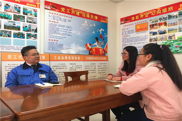 近日,校友工作办公室主任张婷婷带领校友办记者,92级日语文秘专业的优秀毕业生石瑞波(现担任青岛海华纤维有限公司制造部部长兼工会主席)、束晶(现担任青岛海华纤维有限公司管理部生贩管理课课长)、刘品(现担任青岛国恩科技股份有限公司质量部经理)。