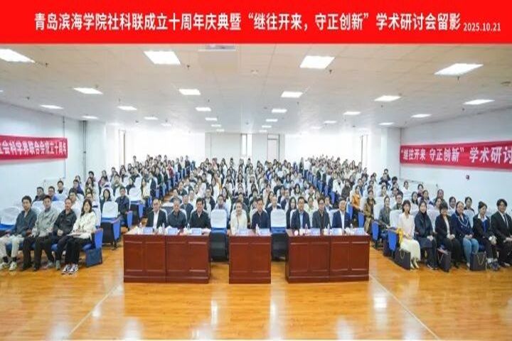 10 月 21 日,青岛滨海学院社科联成立十周年庆典暨学术研讨会在央图报告厅举行,以 “继往开来,守正创新” 为主题,省、市社科联领导及兄弟院校代表等参会,翟明戈主持开幕式。会上,李本雄、孙健致辞回顾十年成果,韩晓萌宣读表彰决定并表彰先进;研讨会环节,专家作专题报告,相关负责人汇报工作。据悉,该校社科联 2015 年成立以来成果丰硕,未来将持续守正创新,助力地方发展与社科繁荣。