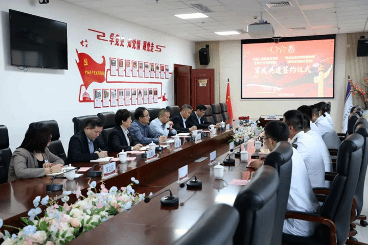 10 月 13 日,青滨附院与中国人民解放军海军吉祥方舟号医院船签署军民共建协议,古镇口管委保障服务局相关负责人出席,仪式由青滨附院明艳主持。会上,双方负责人致辞并观看宣传片,随后完成签约;武超对签约表示祝贺并寄予期望。后续双方将在医疗技术、人才培养等领域合作,共享资源、提升水平,为军民健康和区域发展助力。