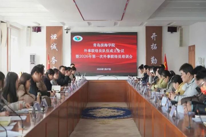 为进一步完善院校两级国际化联动机制,助力学校提升教育对外开放与国际化办学水平。1月27日,青岛滨海学院外事联络员队伍成立会议暨2026年首次外事联络员培训会在岱德楼5楼会议室召开。常务副校长韩晓萌出席会议并讲